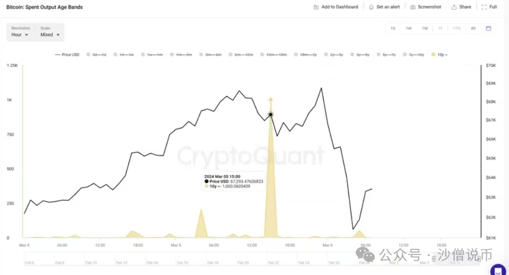 CryptoQuant发现链上数据显示,就在比特币触及69000美元左右的新高,然后周二暴跌至62000美元之前,价值约6900万美元的1000枚比特币被十多年前的地址转移到Coinbase交易所,该研究公司表示与矿工有关。
